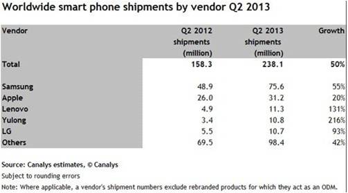 Canalys发布的报告显示,今年第二季度,三星和苹果智能手机出货量的同比增幅分别达到55%和20%,占据出货量排名前两位;而联想、宇龙和LG则分列三到五位。第二季度,中国排名前五的智能手机生产商(联想、宇龙酷派、华为、中兴和小米)在今年第二季度的出货量占到了全球总出货量的20%,去年同期该份额不足15%。