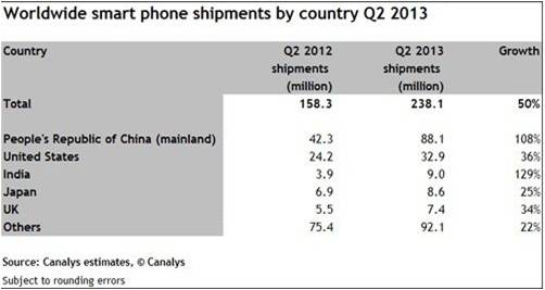 北京时间8月6日消息,据国外媒体报道,全球著名市场研究机构Canalys周一公布了今年第二季度全球智能手机出货量调查报告。报告显示,今年第二季度,全球智能手机出货量约为2.381亿部,同比增幅达到惊人的50%。中国市场的手机销量目前已占全球手机销量的20%,这主要得益于中国大批量生产的低价智能手机销量的猛增。