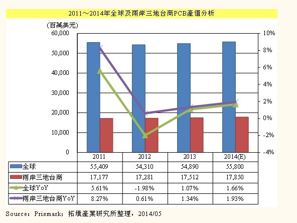 全球PCB产业在历经2012年欧债危机与全球经济低迷的谷底后,2013年随着消费市场回温,开始往上翻转,但PC产业持续受到移动设备崛起的影响,2013年PC出货量仍然持续下滑。虽然移动设备成长快速,但传统大宗用板的PC出货量持续衰退,尚未看到谷底,PCB产业还是难以快速成长。2013年全球PCB产值为 548.9亿美元,较2012年成长1%。观察2012~2014年PCB产值,随着移动设备持续成长及新兴应用崛起下,可看出PCB产值的增幅已趋于稳定,预估2014年仍呈现持续温和的成长。