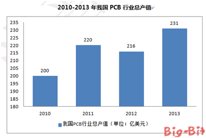 过去十年来,全球PCB持续向亚洲尤其是中国大陆迁移,中国大陆迅速成为电子产品和PCB生产大国。中国因内需市场潜力与生产制造优势,吸引外资纷纷进驻,促使中国大陆PCB产业在短短数年内以倍数成长,行业总产值从2000年的33.68亿美元到2012年的216.36亿美元,已发展成为全球最大的PCB生产国家。据预测,未来几年中国PCB行业仍保持快速增长趋势,在全球的市场地位也将继续提升;2012年至2017年中国PCB产值年复合增长率可达6.0%,到2017年总产值可达到289.72亿美元,占全球PCB总产值比例上升至44.13%。