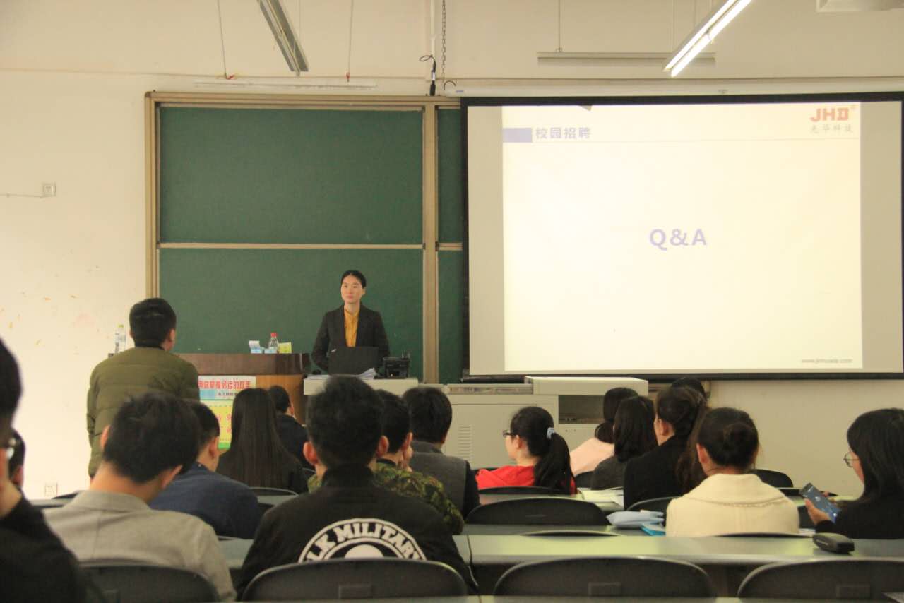 在热烈的交流气氛中,千亿球友会科技人力资源同事向同学们介绍了公司在研发、技术、生产各方面的实力,以及公司历经30多年发展形成的企业文化及“诚信、关怀、勤奋、上进、学习”的用人理念,并一一回答了同学们热心的提问。
