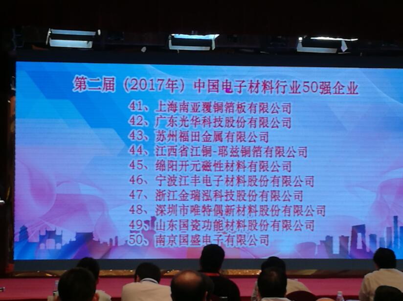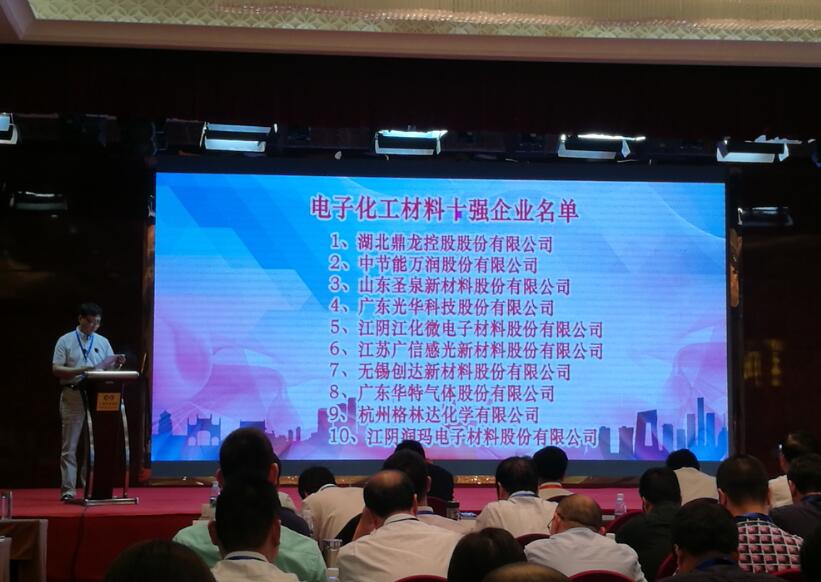 大会重磅发布了第二届(2017年)中国电子材料五十强企业,以及相关电子材料专业十强企业名单。千亿球友会科技凭借在专用电子化学品领域的突出表现,光荣入选中国电子材料五十强,并被评为电子化工材料十强企业!