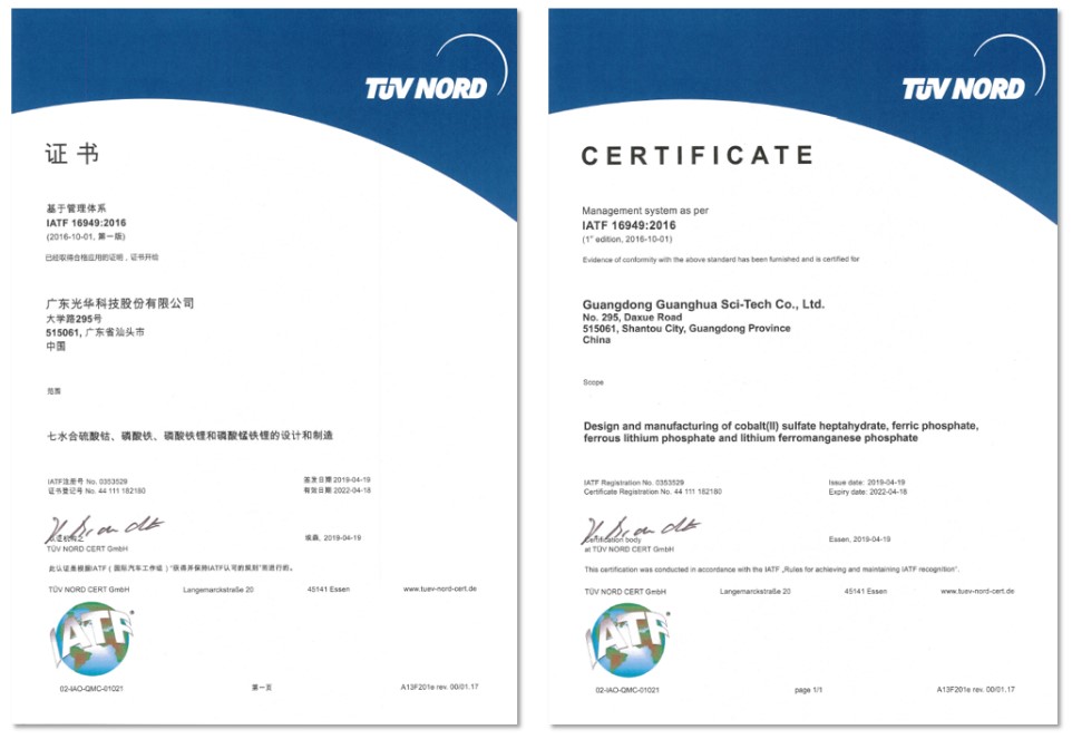 目前,经过不懈努力,公司的七水合硫酸钴、磷酸铁、磷酸铁锂和磷酸锰铁锂近日顺利通过了IATF16949:2016认证,这意味着上述产品的设计及制造达到汽车行业质量管理的先进水平,产品品质更加稳定可靠。