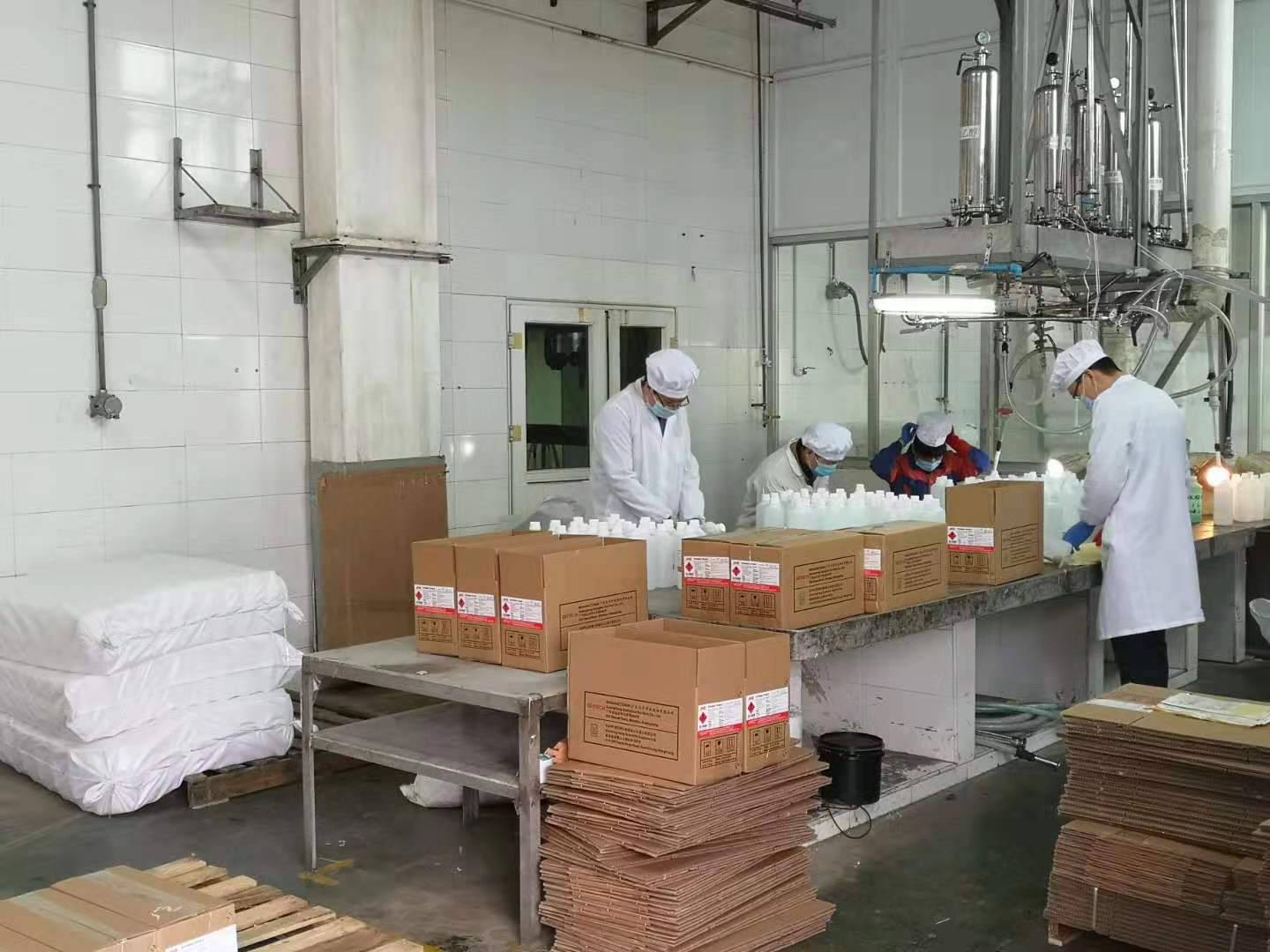 大年初一,公司管理层紧急召开专题会议成立了疫情应急工作小组。初二,进行全面原材料及成品库存盘点,并开始持续捐赠防疫化学品,支援抗疫!初七,经过前期充分准备,启动防疫化学品应急生产,主要生产:75%酒精、过氧化氢、过氧乙酸、次氯酸钠等。截止目前,已有二百多名员工加班加点,全力投入工厂各项工作!