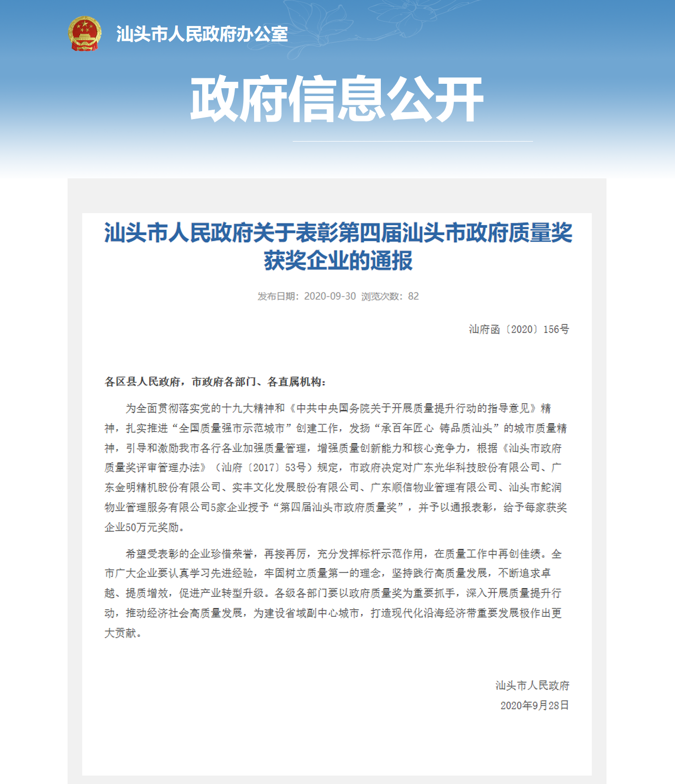 汕头市政府质量奖是汕头市人民政府设立的最高质量奖项,主要参照全国质量奖评奖标准GB/T19580《卓越绩效评价准则》,每两年评选一届,坚持“高标准、严要求、好中选优”的评审原则,选出对质量管理成效显著,产品、服务和经营质量、自主创新能力和市场竞争力等同行业内处于领先地位,以及对地方经济社会发展作出卓越贡献的企业。每届获奖企业或组织数量不多于五家。此奖项对树立行业标杆企业,激励各行各业提质增效,对社会经济高质发展具有极大推动作用。