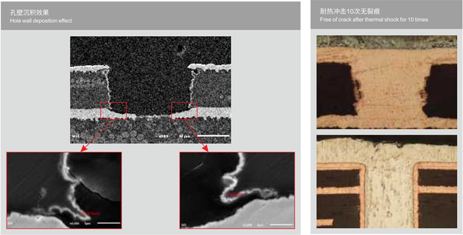 TS-ECuSet系列是应用于水平线的中低温化学沉铜,碱性离子钯活化体系,能够快速再树脂和玻纤构成的孔壁上进行均匀、致密且稳定的化学沉铜层。